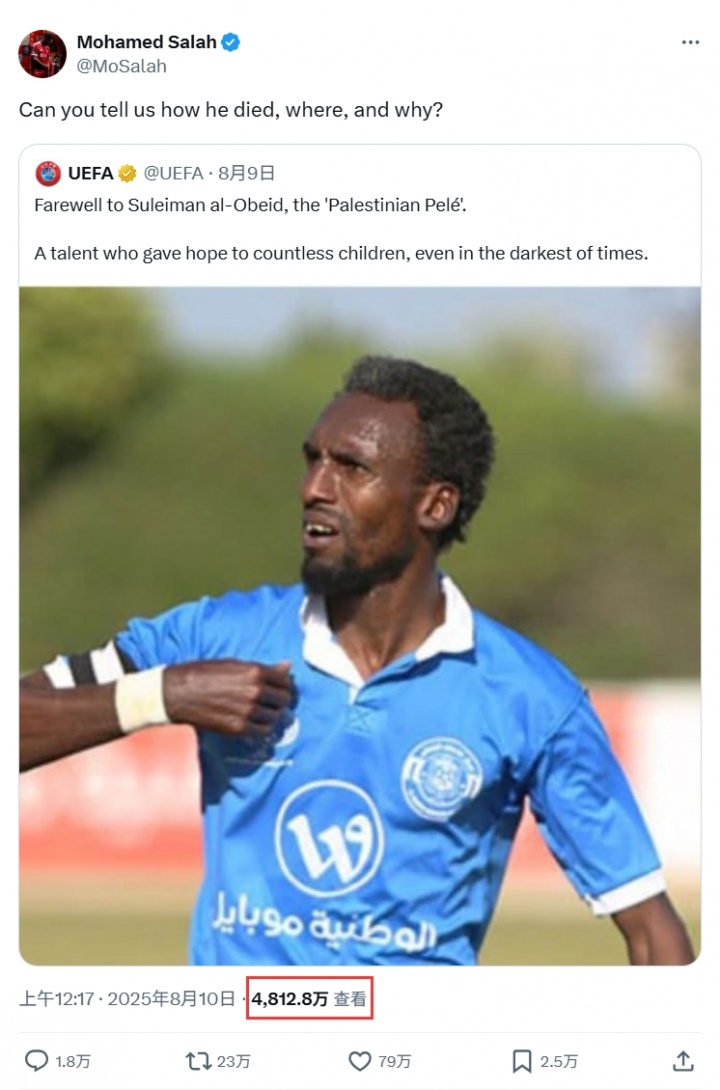 08月10日讯 欧足联官方此前发文,向不首肯丧生的巴勒斯坦球星奥贝德好像默哀。利物浦球星萨拉赫转发了这则帖文,并发出了三个疑问。 欧足联官方此前写说念:“让咱们告别苏莱曼-奥贝德,他被称作‘巴勒斯坦贝利’。即使是在最阴暗的手艺,他也给多数的孩子们带来了但愿。” 萨拉赫转发并向欧足联问说念:“你们能否告诉咱们他是怎么死的,死于那边以及何故而死?” 把柄此前巴勒斯坦足协的晓喻,这位被誉为“巴勒斯坦贝利”的球星苏莱曼-奥贝德在8月6日加沙南部地带恭候东说念主说念倡导挽救时,死于以色列的一次蹙迫当中,年仅40岁。以色列方面并未对此作出具体批驳。 萨拉赫的这则帖文激勉了深广的反响,现在仍是得回了很是4800万的浏览量。 |
