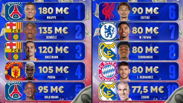 7月24日讯 利物浦照旧官宣签下法兰克福时尚埃基蒂克,Actu Foot数据统计露出他亦然法国历史转会费第6贵的球员。 外媒列法国球员历史转会费榜:欧元 1.8亿,姆巴佩(巴黎) 1.35亿,登贝莱(巴萨) 1.20亿,格列兹曼(巴萨) 1.05亿,博格巴(曼联) 9500万,穆阿尼(巴黎) 9000万,埃基蒂克(利物浦) 8000万,W-福法纳(切尔西) 8000万,琼阿梅尼(皇马) 8000万,卢卡斯(拜仁) 7750万,王人达内(皇马) |