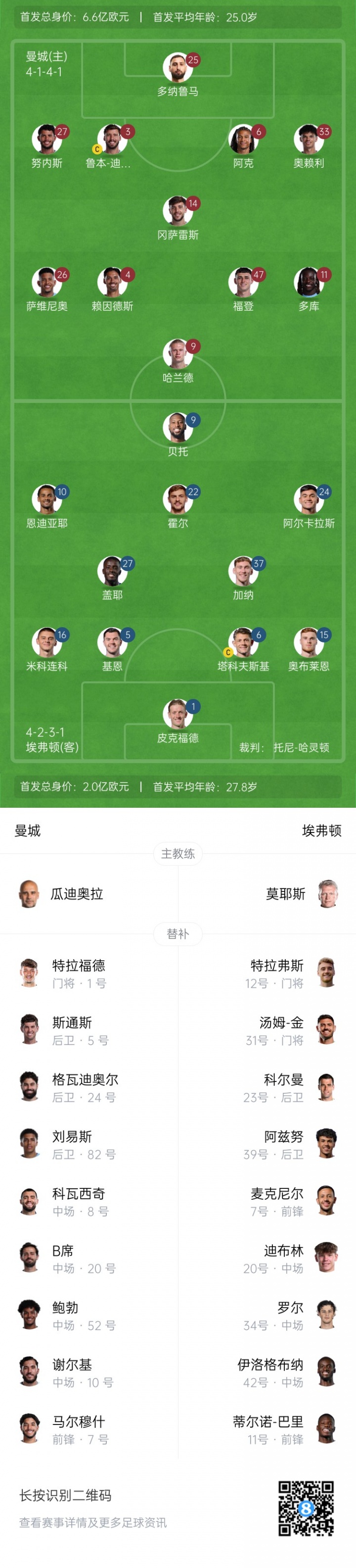 10月18日讯 北京技术今晚22点,英超第8轮,曼城主场迎战埃弗顿,赛前两边公布首发声势。曼城方面,哈兰德和福登领衔首发,尼科-冈萨雷斯、赖因德斯搭档中场;埃弗顿方面,从曼城租出来的格拉利什因祛除要求,缺席本场比赛。 【两边首发】 曼城首发:25-多纳鲁马、3-鲁本-迪亚斯、6-阿克、33-奥赖利、4-赖因德斯、14-尼科-冈萨雷斯、27-努内斯、9-哈兰德、11-多库、26-萨维尼奥、47-福登 曼城替补:1-特拉福德、5-斯通斯、24-格瓦迪奥尔、82-刘易斯、8-科瓦西奇、20-B席、7-马尔穆什、10-谢尔基、52-鲍勃 埃弗顿首发:1-皮克福德、15-奥布莱恩、6-塔科夫斯基、5-迈克尔-基恩、16-米科连科、27-盖耶、37-加纳、24-阿尔卡拉斯、22-霍尔、10-恩迪亚耶、9-贝托 埃弗顿替补:12-特拉福斯、31-汤姆-金、7-麦克尼尔、11-蒂尔诺-巴里、20-迪布林、23-科尔曼、34-罗尔、39-阿兹努、42-伊洛格布纳 实现赛前,曼城4胜1平2负积13分,排行英超积分榜第5;埃弗顿3胜2平2负积11分,排行英超积分榜第8。 【两队交锋历史】 |