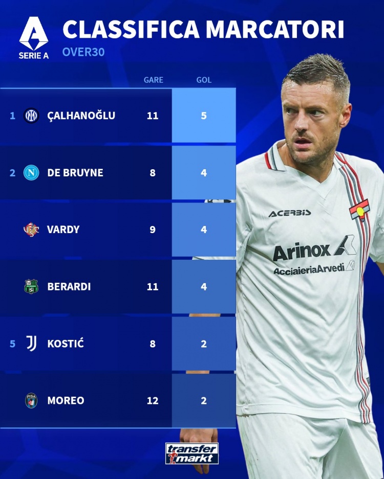 12月2日讯 德国转会市集统计了本赛季年齿30+球员贯注甲的进球数目,比肩出榜单,恰尔汗奥卢5球居首,德布劳内、瓦尔迪、贝拉尔迪4球。 本赛季意甲年齿30+球员...