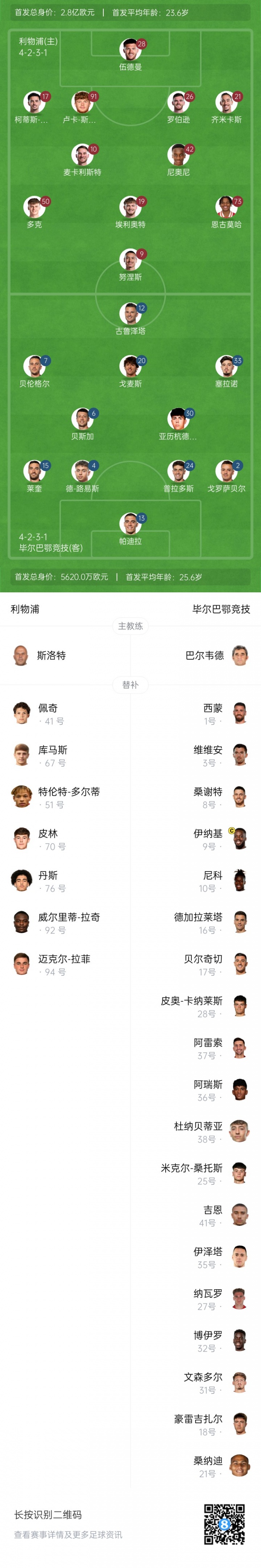 08月04日讯 北京技巧8月5日0点,足球友谊赛,利物浦vs毕尔巴鄂竞技。赛前利物浦公布了比赛首发气势。 利物浦首发:28-伍德曼、21-皆米卡斯、29-罗伯逊、91-斯蒂芬森、17-琼斯、10-麦卡利斯特、42-尼奥尼、50-多克、19-埃利奥特、73-恩古莫哈、9-努涅斯 利物浦替补:佩奇、多尔蒂、库马斯、皮林、丹斯、拉吉、拉菲 毕尔巴鄂竞技首发:13-帕迪拉、2-戈罗萨贝尔、24-普拉多斯、4-德-路易斯、15-莱奎、30-亚历杭德罗-雷戈、6-贝斯加、33-塞拉诺、20-乌奈-戈麦斯、7-贝伦格尔、12-古鲁泽塔