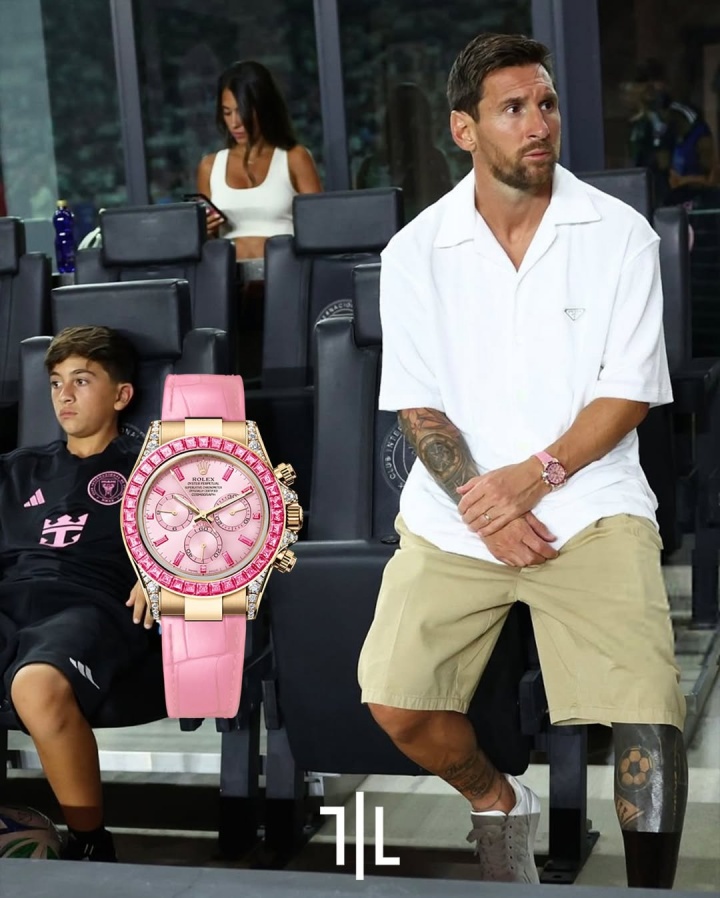 08月01日讯 此前梅西看迈阿密比赛戴劳力士表,价值超70万镑激发烧议。太阳报发文清点了梅西的腕表储藏。 太阳报默示梅西这块劳力士Barbie表是限量款,转售价越过70万镑。使用了粉红色蓝对峙钻石,18k黄金。其配色和迈阿密海外主场球衣色彩相符。这款表天下仅限量10块。梅西还有一款价值超50万镑的限量款劳力士Daytona表。