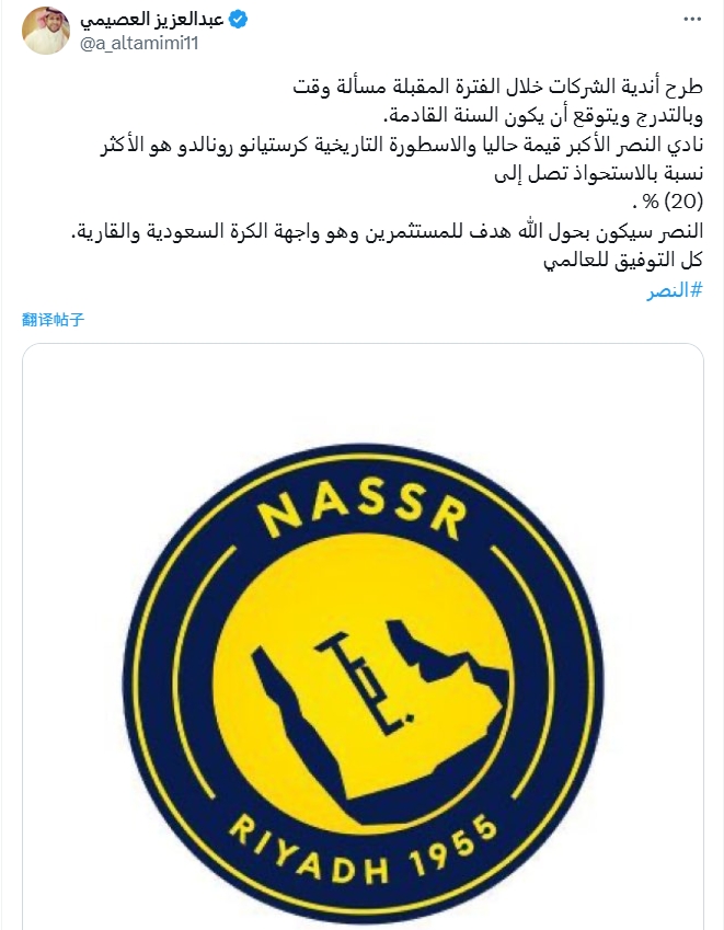 08月01日讯 沙特记者عبدالعزيز العصيمي报谈,C罗现时领故意雅得得手20%股权。 记者暗示,改日一段时间企业俱乐部的推出仅仅时间问题,正在沉静进行,瞻望将在来岁完成。 利雅得得手现时是最有价值的俱乐部,C罗现时捏股比例最高,达到了20%,利雅得得手将成为投资者热心的焦点,成为沙特和亚洲足球的门面。