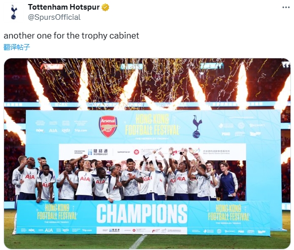 08月01日讯 昨日的季前友谊赛热刺1-0打败阿森纳,拿下到手。这场友谊赛赛后还举行了受奖庆典。 热刺官方赛后发文:奖杯陈设室冠军+1。上赛季热刺夺得欧联杯冠军,本月他们还将在欧超杯对阵巴黎。 |