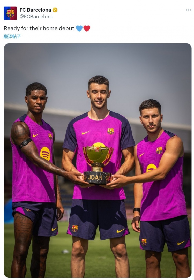 8月9日讯 北京时辰8月11日凌晨,巴萨将在甘伯杯比赛中对阵科莫。 巴萨官方更新社媒动态,晒出三位新援拉什福德、霍安-加西亚、巴德吉手捧甘伯杯奖杯的合照,配文:“为主场首秀作念好准备。” |