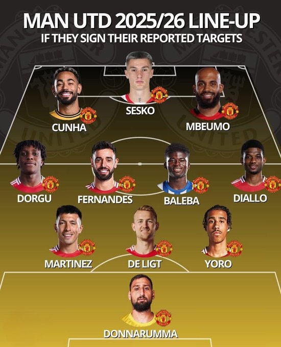 注:多纳鲁马、巴莱巴为转会谰言,有音问称曼联有益签下他们 门将: 多纳鲁马(别传) 后卫: 利马、德里赫特、约罗 中场: 多古、B费、巴莱巴(别传)、迪亚洛 时尚: 库尼亚、塞斯科(已官宣)、姆贝莫 |