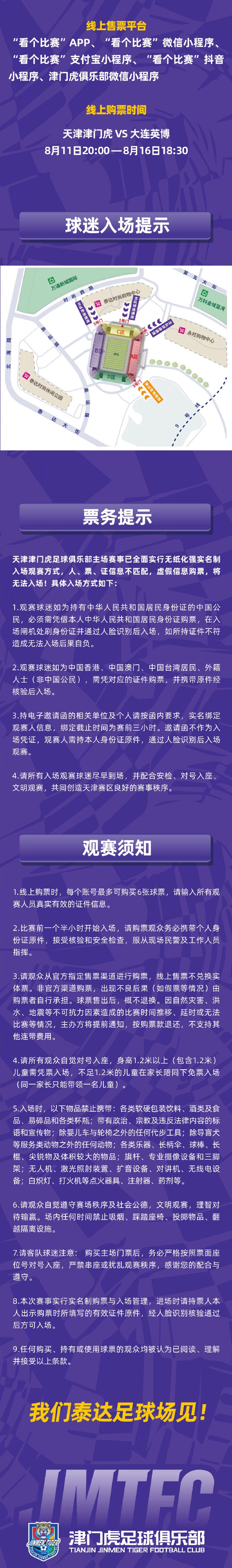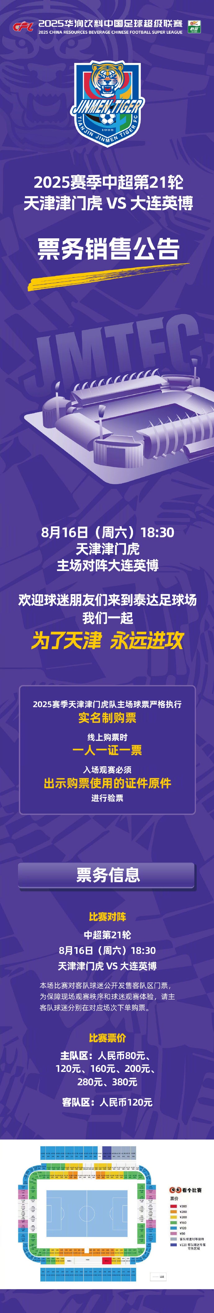 2025华润饮料中超联赛第21轮天津津门虎VS大连英博票务销售公告 本场比赛对客队球迷公树立售客队区门票,为保险现场不雅赛次序和球迷不雅赛体验,请主客队球迷仔细阅读销售公告,并分辨在对应场次下单购票。