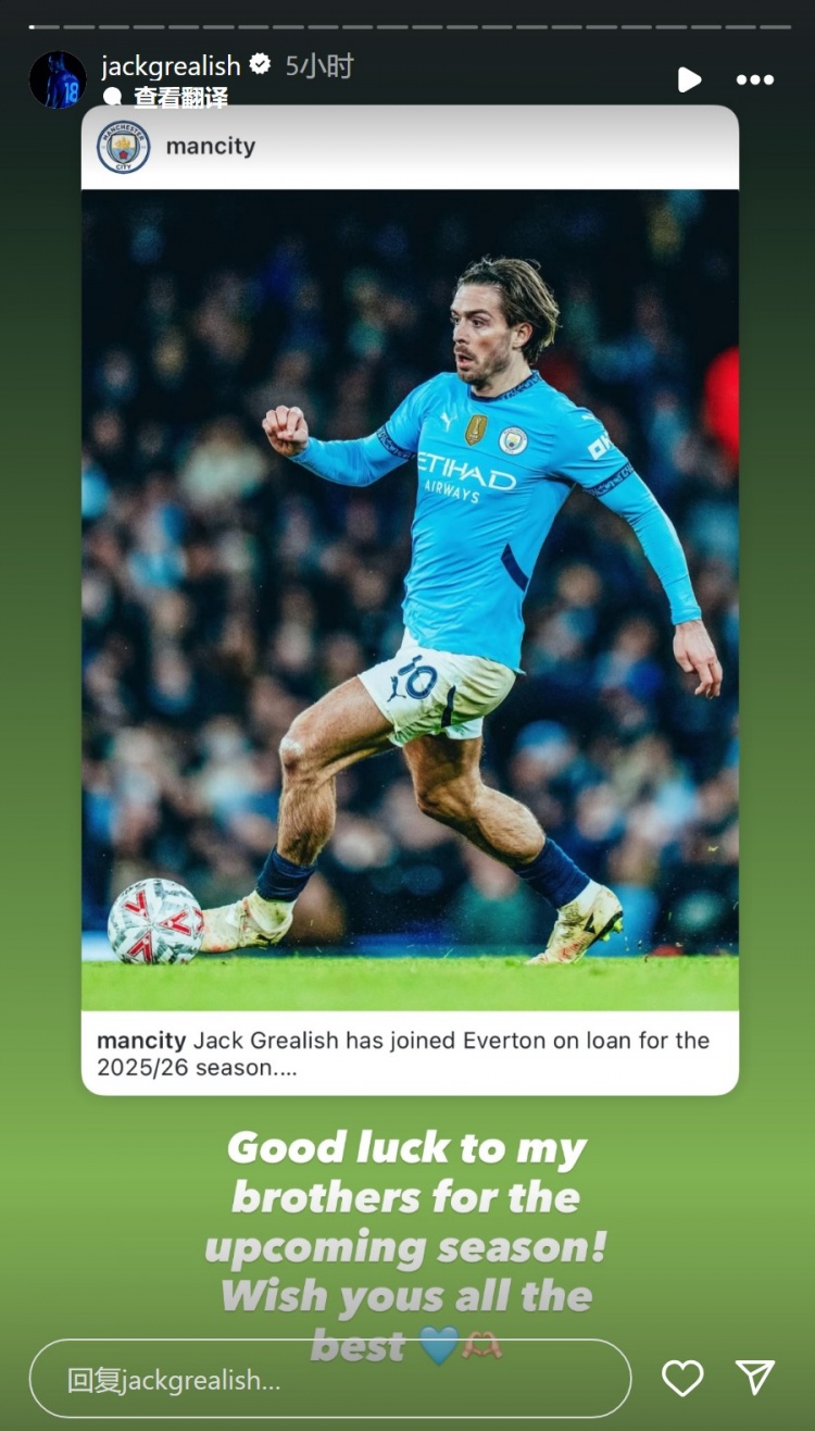 8月13日讯 曼城报复手格拉利什租赁加盟埃弗顿,条约中包含5000万英镑选拔买断条件。 格拉利什社媒转发曼城的官宣动态,并配文:“祝我的昆玉们新赛季好运,一切获胜!” |