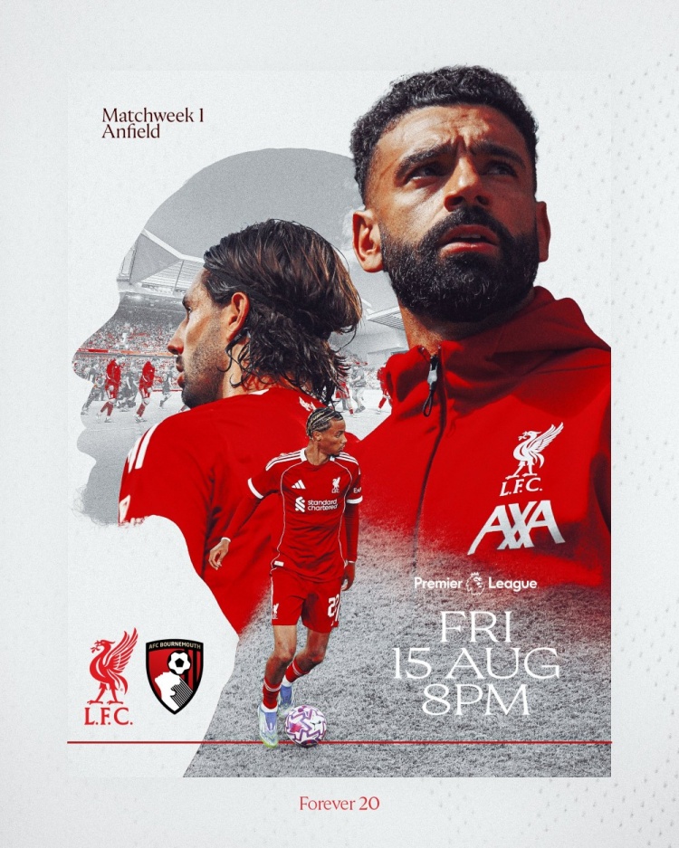 8月15日讯 北京技能8月16日凌晨3:00,2025-26赛季英超联赛第一轮,利物浦将坐在安菲尔德球场迎战伯恩茅斯。 赛前,赤军官方晒出海报,为本场比赛预热。萨拉赫领衔多名球员出镜,包括新援埃基蒂克,海报左上角为比赛时势信息,左下角为对阵两边队徽,右下角为开球技能。 |