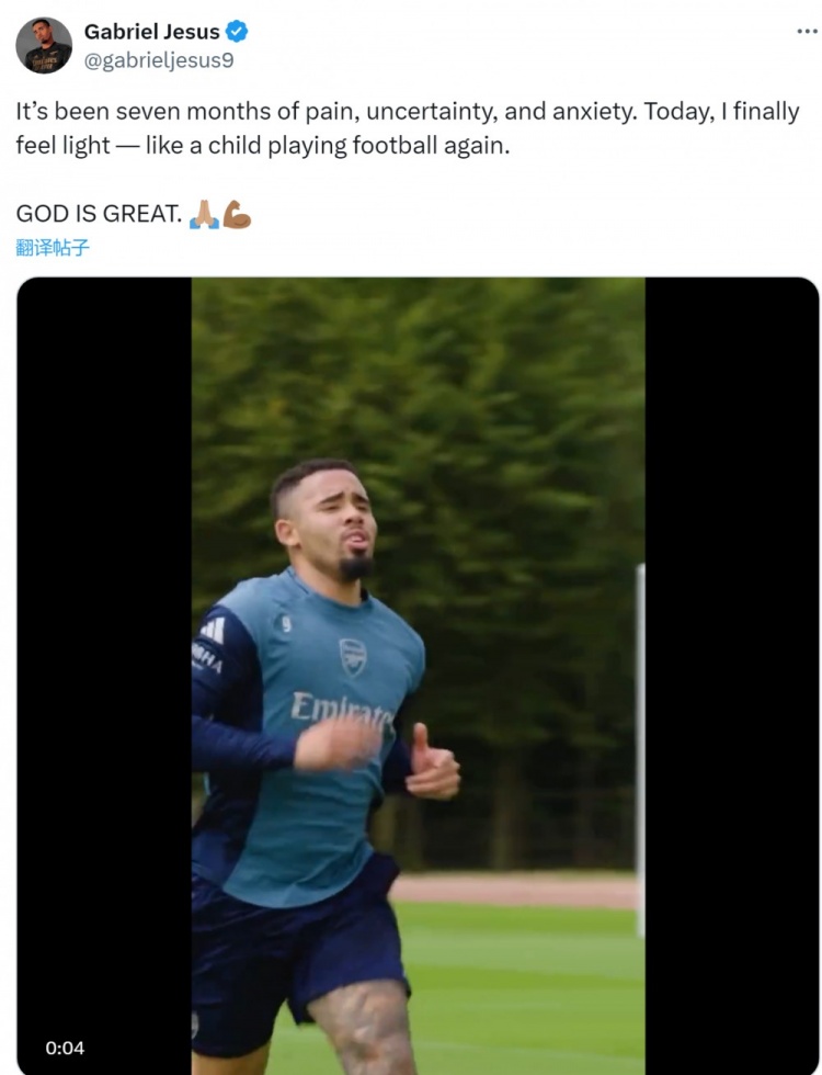 8月25日讯 阿森纳前卫热苏斯更新社媒动态,晒出收复践诺的视频。 热苏斯社媒晒出践诺的视频,配文:“七个月以来,我一直饱受可怜、不笃定和急躁的折磨。如今我终于感到轻易了——就像一个孩子又运转踢足球了。天主是伟大的。”