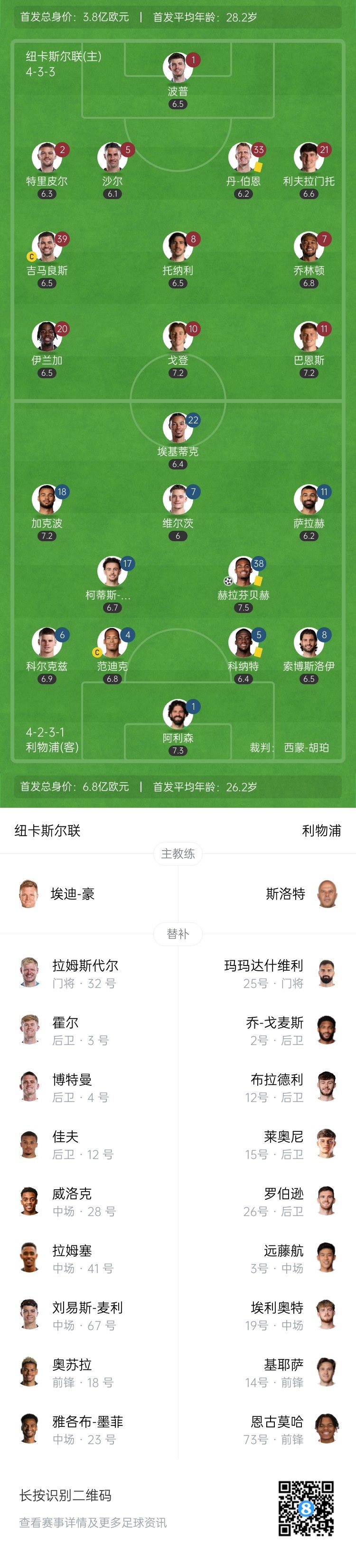 【比赛重要事件】 第35分钟,加克波横传,赫拉芬贝赫禁区前接球,浪荡后突施暗箭,皮球直穿近角!擦着门柱打进死角!利物浦1-0率先纽卡↓ 第45+3分钟,戈登前场飞铲范迪克,主裁判场边不雅看回放后,取消黄牌,将戈登直红罚下!纽卡剩10东谈主应战↓ 【比赛焦点蓦的】 第8分钟,赫拉芬贝赫侧方铲倒吉马良斯!主裁判出示黄牌警告↓ 第13分钟,维尔茨禁区内左侧起脚兜射!皮球被门将扑出↓ 第17分钟,托纳利主罚禁区外左侧狂妄球,径直平抽进禁区,谁也莫得遭受,径直出了右侧边线↓ 第28分钟,巴恩斯左路传中,戈登高高跃来源球攻门!皮球略略向上横梁↓ 第29分钟,纽卡右路冲突下底传中,小禁区前戈登包抄射门,被打扰了一下,阿利森将球扑住↓ 第42分钟,利物浦高速反击,索博斯洛伊横传禁区,利物浦双鬼拍门但没能遭受皮球↓ 【两边威望】