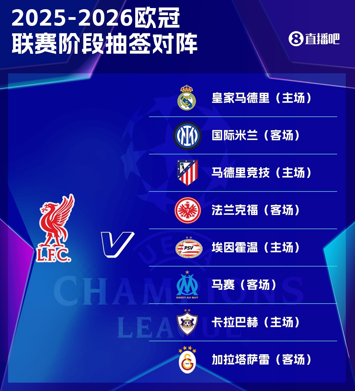 8月29日讯 25-26赛季欧冠联赛阶段抽签,利物浦联赛阶段8支敌手出炉。 利物浦敌手:皇家马德里(主)、海外米兰(客)、马德里竞技(主)、法兰克福(客)、埃因霍温(主)、马赛(客)、卡拉巴赫(主)、加拉塔萨雷(客) |