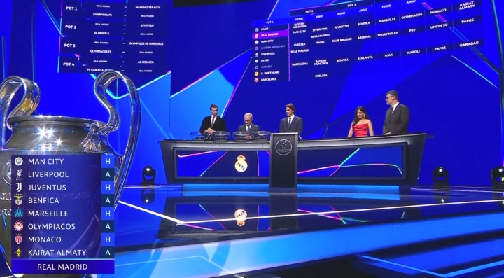 8月29日讯 25-26赛季欧冠联赛阶段抽签,皇马联赛阶段8支敌手出炉。 皇马敌手:曼城(主)、利物浦(客)、尤文(主)、本菲卡(客)、马赛(主)、奥林匹亚科斯(客)、摩纳哥(主)、阿拉木图凯拉特(客)
