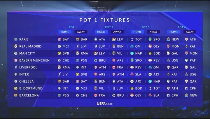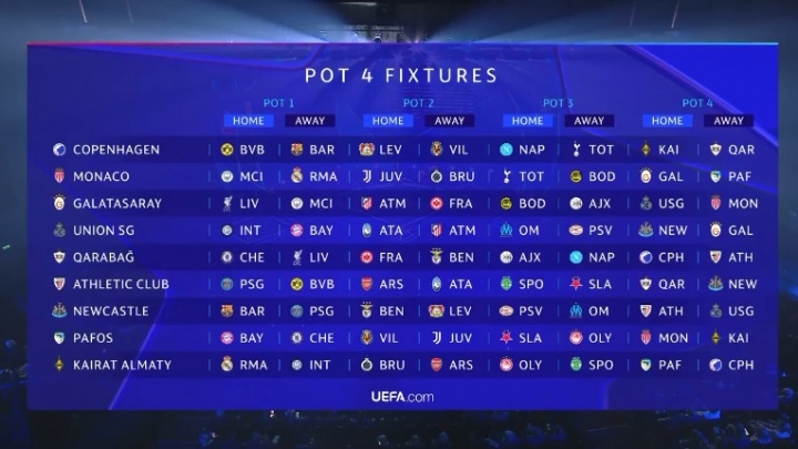 第四档: 毕尔巴鄂竞技敌手:巴黎圣日耳曼(主)、多特蒙德(客)、阿森纳(主)、亚特兰大(客)、葡萄牙体育(主)、布拉格斯拉维亚(客)、卡拉巴赫(主)、纽卡斯尔联(客) 卡拉巴赫敌手:切尔西(主)、利物浦(客)、法兰克福(主)、本菲卡(客)、阿贾克斯(主)、那不勒斯(客)、哥本哈根(主)、毕尔巴鄂竞技(客) 摩纳哥敌手:曼城(主)、皇家马德里(客)、尤文图斯(主)、布鲁日(客)、热刺(主)、博德醒目(客)、加拉塔萨雷(主)、帕福斯(客) 加拉塔萨雷敌手:利物浦(主)、曼城(客)、马德里竞技(主)、法兰克福(客)、博德醒目(主)、阿贾克斯(客)、圣吉罗斯(主)、摩纳哥(客) 纽卡斯尔联敌手:巴塞罗那(主)、巴黎圣日耳曼(客)、本菲卡(主)、勒沃库森(客)、埃因霍温(主)、马赛(客)、毕尔巴鄂竞技(主)、圣吉罗斯(客) 圣吉罗斯敌手:海外米兰(主)、拜仁慕尼黑(客)、亚特兰大(主)、马德里竞技(客)、马赛(主)、埃因霍温(客)、纽卡斯尔联(主)、加拉塔萨雷(客) 帕福斯敌手:拜仁慕尼黑(主)、切尔西(客)、比利亚雷亚尔(主)、尤文图斯(客)、布拉格斯拉维亚(主)、奥林匹亚科斯(客)、摩纳哥(主)、阿拉木图凯拉特(客) 哥本哈根敌手:多特蒙德(主)、巴塞罗那(客)、勒沃库森(主)、比利亚雷亚尔(客)、那不勒斯(主)、热刺(客)、阿拉木图凯拉特(主)、卡拉巴赫(客) 阿拉木图凯拉特敌手:皇家马德里(主)、海外米兰(客)、布鲁日(主)、阿森纳(客)、奥林匹亚科斯(主)、葡萄牙体育(客)、帕福斯(主)、哥本哈根(客)