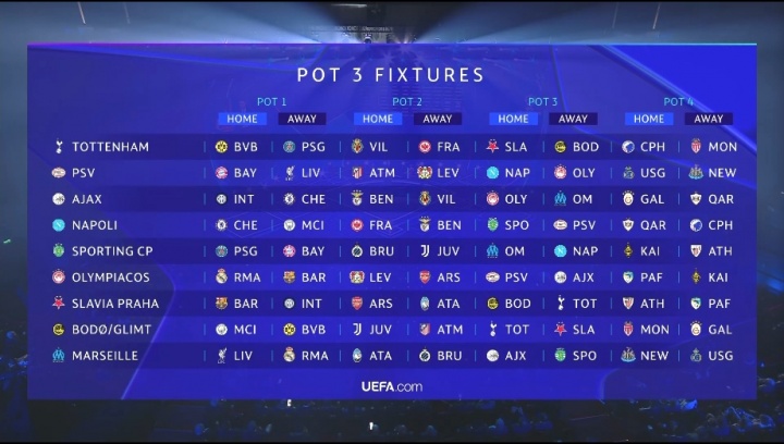 第三档: 马赛敌手:利物浦(主)、皇家马德里(客)、亚特兰大(主)、布鲁日(客)、阿贾克斯(主)、葡萄牙体育(客)、纽卡斯尔联(主)、圣吉罗斯(客) 热刺敌手:多特蒙德(主)、巴黎圣日耳曼(客)、比利亚雷亚尔(主)、法兰克福(客)、布拉格斯拉维亚(主)、博德醒目(客)、哥本哈根(主)、摩纳哥(客) 博德醒目敌手:曼城(主)、多特蒙德(客)、尤文图斯(主)、马德里竞技(客)、热刺(主)、布拉格斯拉维亚(客)、摩纳哥(主)、加拉塔萨雷(客) 葡萄牙体育敌手:巴黎圣日耳曼(主)、拜仁慕尼黑(客)、布鲁日(主)、尤文图斯(客)、马赛(主)、那不勒斯(客)、阿拉木图凯拉特(主)、毕尔巴鄂竞技(客) 奥林匹亚科斯敌手:皇家马德里(主)、巴塞罗那(客)、勒沃库森(主)、阿森纳(客)、埃因霍温(主)、阿贾克斯(客)、帕福斯(主)、阿拉木图凯拉特(客) 阿贾克斯敌手:海外米兰(主)、切尔西(客)、本菲卡(主)、比利亚雷亚尔(客)、奥林匹亚科斯(主)、马赛(客)、加拉塔萨雷(主)、卡拉巴赫(客) 布拉格斯拉维亚敌手:巴塞罗那(主)、海外米兰(客)、阿森纳(主)、亚特兰大(客)、博德醒目(主)、热刺(客)、毕尔巴鄂竞技(主)、帕福斯(客) 埃因霍温敌手:拜仁慕尼黑(主)、利物浦(客)、马德里竞技(主)、勒沃库森(客)、那不勒斯(主)、奥林匹亚科斯(客)、圣吉罗斯(主)、纽卡斯尔联(客) 那不勒斯敌手:切尔西(主)、曼城(客)、法兰克福(主)、本菲卡(客)、葡萄牙体育(主)、埃因霍温(客)、卡拉巴赫(主)、哥本哈根(客)
