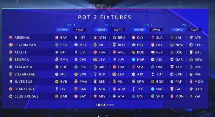 第二档: 阿森纳敌手:拜仁慕尼黑(主)、海外米兰(客)、马德里竞技(主)、布鲁日(客)、奥林匹亚科斯(主)、布拉格斯拉维亚(客)、阿拉木图凯拉特(主)、毕尔巴鄂竞技(客) 勒沃库森敌手:巴黎圣日耳曼(主)、曼城(客)、比利亚雷亚尔(主)、本菲卡(客)、埃因霍温(主)、奥林匹亚科斯(客)、纽卡斯尔联(主)、哥本哈根(客) 马德里竞技敌手:海外米兰(主)、利物浦(客)、法兰克福(主)、阿森纳(客)、博德醒目(主)、埃因霍温(客)、圣吉罗斯(主)、加拉塔萨雷(客) 本菲卡敌手:皇家马德里(主)、切尔西(客)、勒沃库森(主)、尤文图斯(客)、那不勒斯(主)、阿贾克斯(客)、卡拉巴赫(主)、纽卡斯尔联(客) 亚特兰大敌手:切尔西(主)、巴黎圣日耳曼(客)、布鲁日(主)、法兰克福(客)、布拉格斯拉维亚(主)、马赛(客)、毕尔巴鄂竞技(主)、圣吉罗斯(客) 比利亚雷亚尔敌手:曼城(主)、多特蒙德(客)、尤文图斯(主)、勒沃库森(客)、阿贾克斯(主)、热刺(客)、哥本哈根(主)、帕福斯(客) 尤文图斯敌手:多特蒙德(主)、皇家马德里(客)、本菲卡(主)、比利亚雷亚尔(客)、葡萄牙体育(主)、博德醒目(客)、帕福斯(主)、摩纳哥(客) 法兰克福敌手:利物浦(主)、巴塞罗那(客)、亚特兰大(主)、马德里竞技(客)、热刺(主)、那不勒斯(客)、加拉塔萨雷(主)、卡拉巴赫(客) 布鲁日敌手:巴塞罗那(主)、拜仁慕尼黑(客)、阿森纳(主)、亚特兰大(客)、马赛(主)、葡萄牙体育(客)、摩纳哥(主)、阿拉木图凯拉特(客)