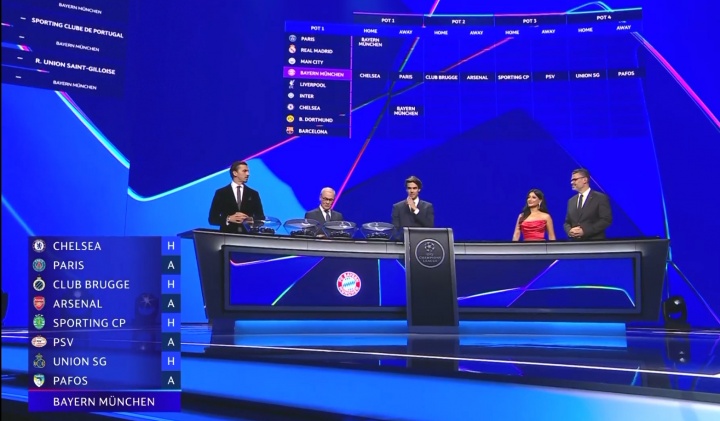 8月29日讯 25-26赛季欧冠联赛阶段抽签,拜仁联赛阶段8支敌手出炉。 拜仁敌手:切尔西(主)、巴黎(客)、布鲁日(主)、阿森纳(客)、葡萄牙体育(主)、埃因霍温(客)、圣吉罗斯(主)、帕福斯(客)