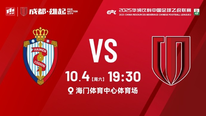 比赛日 2025华润饮料中乙联赛 第28轮 ⚽ 海门珂缔缘 vs 成齐蓉城B队 📅 10月4日(周六)19:30 🥅 海门体育中心知晓场 |