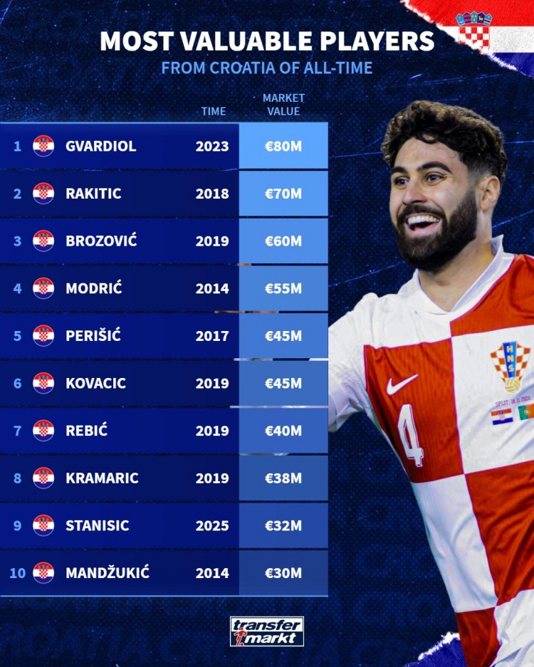 10月13日讯 德国转会阛阓统计了克罗地亚球员的历史最高身价,比肩出克罗地亚球员历史身价排行,格瓦迪奥尔8000万欧居首。 克罗地亚球员历史最高身价榜: 格瓦迪奥尔(2023)——8000万欧 拉基蒂奇(2018)——7000万欧 布罗佐维奇(2019)——6000万欧 莫德里奇(2014)——5500万欧 佩里西奇(2017)——4500万欧 科瓦西奇(2019)——4500万欧 雷比奇(2019)——4000万欧 克拉马里奇(2019)——3800万欧 斯坦尼西奇(2025)——3200万欧 曼朱基奇(2014)——3000万欧 |
