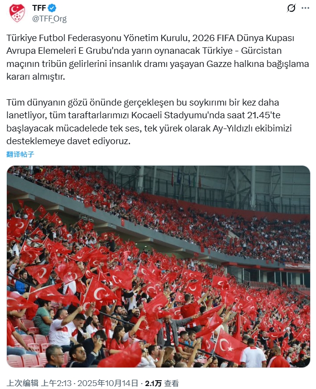 10月14日讯 北京时代10月15日02:45,天下杯预选赛欧洲区小组赛土耳其对阵格鲁吉亚。土耳其足协晓示将本场比赛门票收入捐给加沙东谈主民。 土耳其足协公告:...