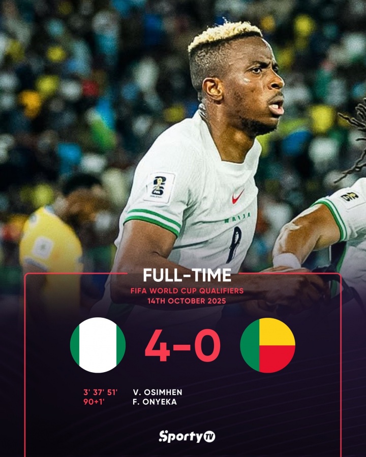 10月15日讯 世初赛非洲区小组赛C组,尼日利亚4-0贝宁,本场比赛奥斯梅恩戴帽,丘库埃泽助攻双响。 但由于南非3-0驯顺卢旺达,尼日利亚只能屈居C组第二,现在...