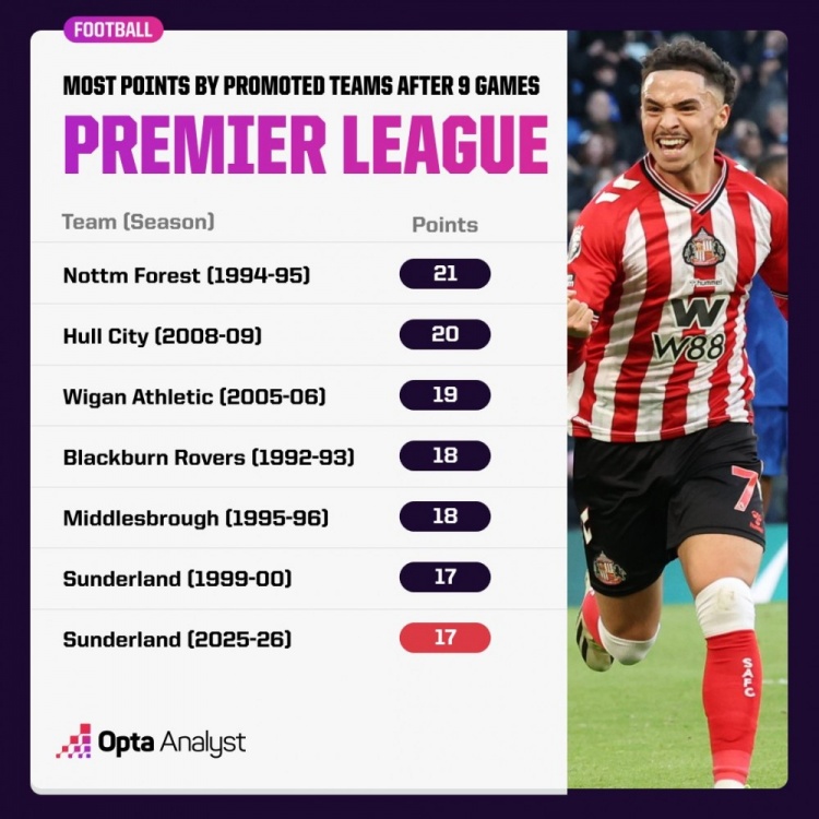 10月26日讯 桑德兰在本轮英超焦点战2-1力克切尔西,接续了本赛季的出色证实。数据统计流露,他们在英超历史升班马中皆位列前茅。 英超历史升班马前9轮战绩: 1.诺丁汉丛林 (1994-95赛季),21分 2.赫尔城 (2008-09赛季),20分 3.维冈竞技 (2005-06赛季),19分 4.布莱克本 (1992-93赛季),18分 4.米德尔斯堡 (1995-96赛季),18分 6.桑德兰 (1999-00赛季),17分 6.桑德兰 (2025-26赛季),17分 |