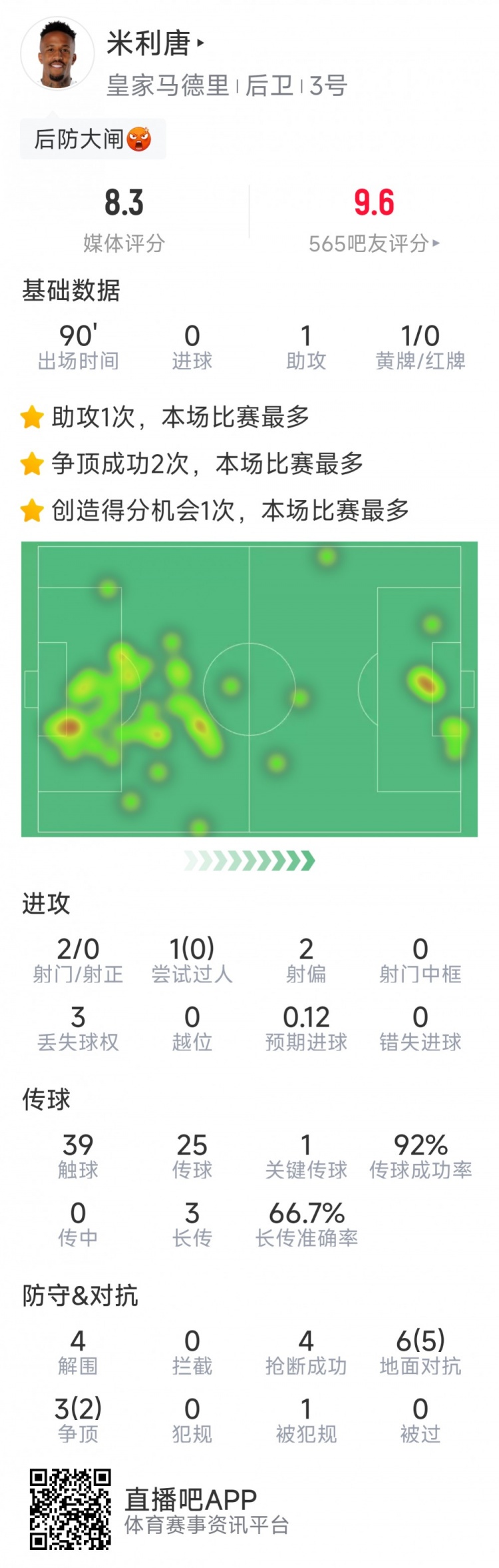10月27日讯 在本轮西甲,皇马2-1打败巴萨,以下为米利唐本场数据: 比赛时辰90分钟 1次助攻 2射0正 39次触球 1次关节传球 传球生服从92% 4次突围 4次抢断 9次抵挡7次生效 评分8.3分 |