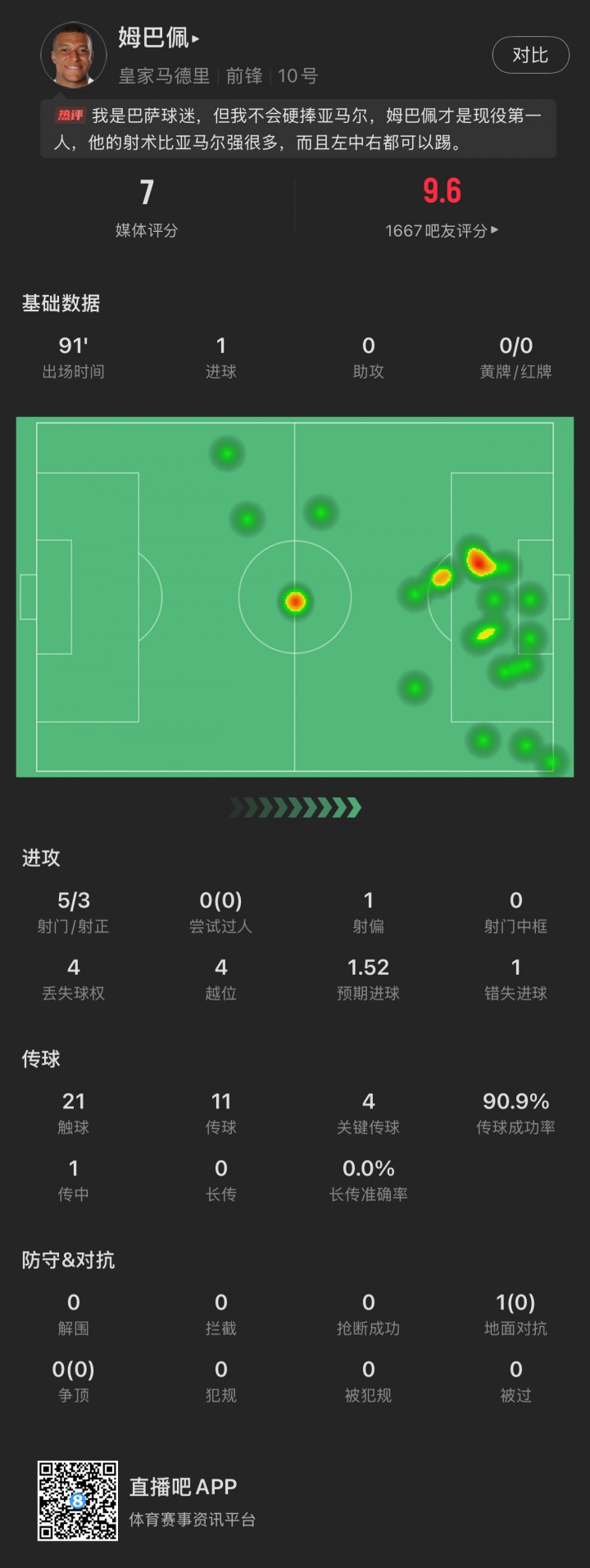 10月27日讯 皇马2-1巴萨,适度国度德比四连败。姆巴佩破门+失点+两球被吹,第90分钟被换下。 姆巴佩全国波被吹越位 姆巴佩反越位破门 姆巴佩破门但越位 姆巴佩点球被扑 姆巴佩反击低射偏出 姆巴佩被换下场
