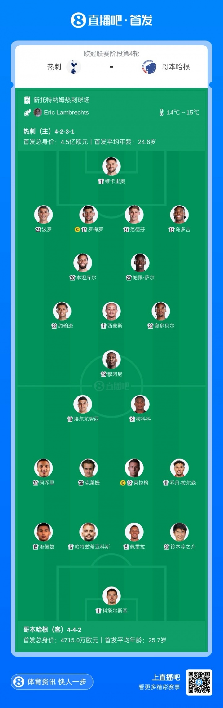 11月5日讯 欧冠联赛阶段第4轮,热刺主场迎战哥本哈根,赛前两边首发公布。 热刺首发:1-维卡里奥、13-乌多吉、17-罗梅罗、23-波罗、37-范德芬、7-西蒙斯、29-萨尔、30-本坦库尔、22-布伦南-约翰逊、28-奥多贝尔、39-穆阿尼 热刺替补:31-金斯基、40-奥斯汀、4-丹索、24-斯彭斯、76-詹姆斯·罗斯威尔、6-帕利尼亚、57-里奥·凯雷马滕、9-里沙利松、44-斯卡列特、70-优素福·阿赫姆里奇 哥本哈根首发:1-科塔尔斯基、15-马科斯·洛佩斯、6-哈特兹蒂亚科斯、5-加布里埃尔·佩雷拉、20-铃木淳之介、30-伊莱亚斯·阿乔里、36-威廉·克莱姆、12-卢卡斯·莱拉格、11-乔丹·拉尔森、10-埃尔尤努西、9-穆科科 哥本哈根替补:31-鲁纳尔松、61-奥斯卡·布尔、4-加拉南加、22-约拉姆·扎格、7-维克托·克莱森、16-罗伯特、21-马德森、14-科内柳斯、39-达达森 【本场比赛两边首发阵型图】