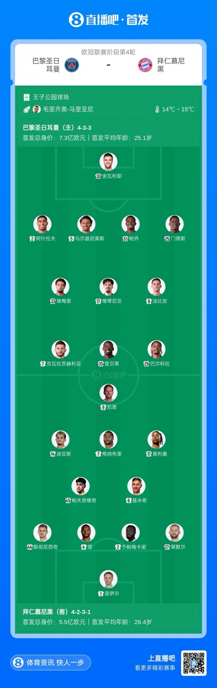 11月5日讯 欧冠联赛阶段第4轮,巴黎对阵拜仁,赛前首发公布。巴黎方面登贝莱、维蒂尼亚、门德斯出战,拜仁方面凯恩、迪亚斯、奥利塞先发。 巴黎圣日耳曼首发:30-舍瓦利耶、2-阿什拉夫、5-马尔基尼奥斯、25-努诺·门德斯、51-帕乔、8-法比安、17-维蒂尼亚、33-扎伊尔·埃梅里、7-克瓦拉茨赫利亚、10-登贝莱、29-巴尔科拉 巴黎圣日耳曼替补:39-萨福诺夫、89-马林、4-贝拉尔多、21-卢卡斯·埃尔南德斯、24-马尤卢、87-内维斯、9-贡萨洛·拉莫斯、19-李刚仁、47-恩贾恩图、49-姆巴耶 拜仁慕尼黑首发:1-诺伊尔、27-莱默尔、2-于帕梅卡诺、4-塔、44-斯坦尼西奇、45-帕夫洛维奇、6-基米希、7-格纳布里、14-路易斯·迪亚斯、17-奥利塞、9-凯恩 拜仁慕尼黑替补:26-乌尔赖希、40-乌尔比希、3-金玟哉、8-格雷茨卡、11-杰克逊、20-比朔夫、22-格雷罗、23-博伊、42-伦纳特·卡尔 巴黎和拜仁当今欧冠齐是三连胜,分列前二。两队历史共交锋15次,巴黎7胜,拜仁8胜。