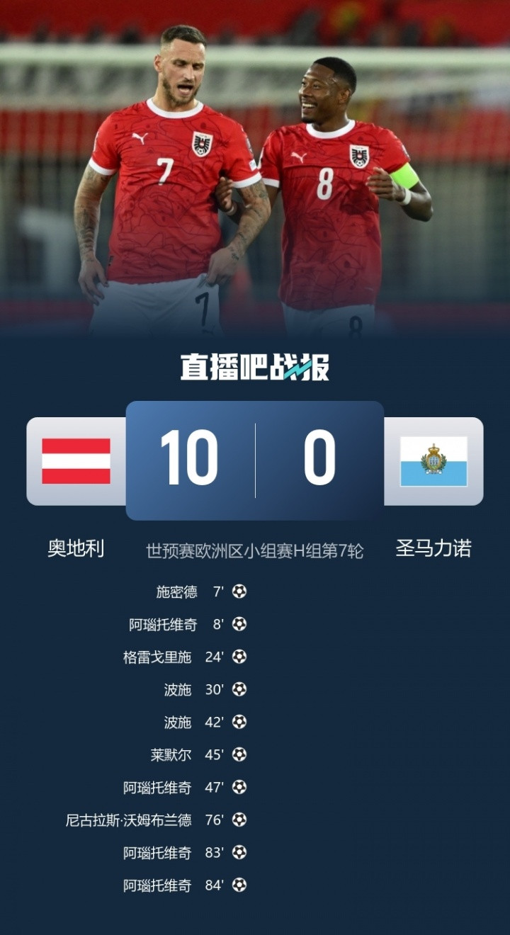 奥地利10-0狂胜圣马力诺,阿瑙托维奇大四喜。奥地利5连胜领跑H组;圣马力诺6连败、只进1球狂丢28球,名次倒数第一。 小组头名!中国香港4-3绝杀孟加拉国李小恒替补戴帽艾华顿传射