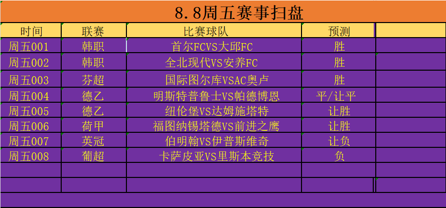 周五 001 韩职:首尔FCVS大邱FC 时刻:2025-08-08 18:30 形状:首尔寰球杯球场 首尔FC本赛季举座阐扬尚可、持续了上赛季的褂讪阐扬,结果现在他们以9胜9平6负的战绩暂居韩职老例联赛积分榜第4位,踏进于争冠附加区内。现状方面,首尔FC上场与西甲朱门巴塞罗那队进行了一场友谊赛,球队最终3-7输给了敌手,但濒临这么的朱门球队更多的是与亚马尔、莱万等寰球级球星过招来普及技计谋水平,恶果并不热切,回到联赛的球队例必会充满信心;联赛方面,首尔FC天然在上轮联赛作念客1-0降服了大田市民,然而球队近期照旧出现了赢输瓜代的景象,竞技状况并非褂讪。不外从对赛层面上来看,首尔FC最近两次对阵大田市民均得到告捷,球队在对赛心计层面照旧占据赫然上风的。 大邱FC本赛季阐扬着实令东说念主大失所望,现在球队24轮联赛事后仅得到3胜5平16负的劣绩排行韩职老例联赛积分榜倒数第一位,也曾落伍争冠附加区18分,全队赛季高大策画照旧力求保级。从现状来看,大邱FC最近也与巴塞罗那进行了较量,最终球队主场0-5大北敌手;联赛方面,大邱FC也曾诱惑13轮联赛未始胜绩,现在更是处于联赛三连败当中,竞技状况格外低迷。从攻守端角度来看,大邱FC攻防两头均阐扬欠安,近10场联赛仅打进8球却丢掉23球,锋线乏力与防宁疏忽成为制约球队发展的双重镣铐,讲明注解组吸需调整计谋体系以扭转流弊。 详细分析:大邱FC本赛季举座阐扬极差,现在仅排在联赛积分榜倒数第一位;何况球队本赛季联赛客场未始胜绩的同期败率高达75.0%,客场虫属性无疑;说七说八,本战看好首尔FC镇守主场之利拿下敌手。 保举:胜 比分:1-0 2-0 进球数:1/2球