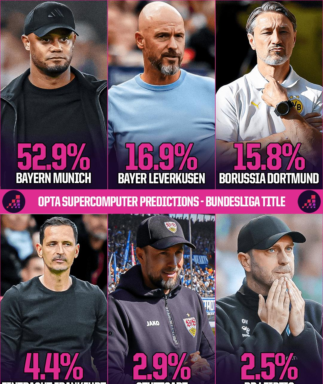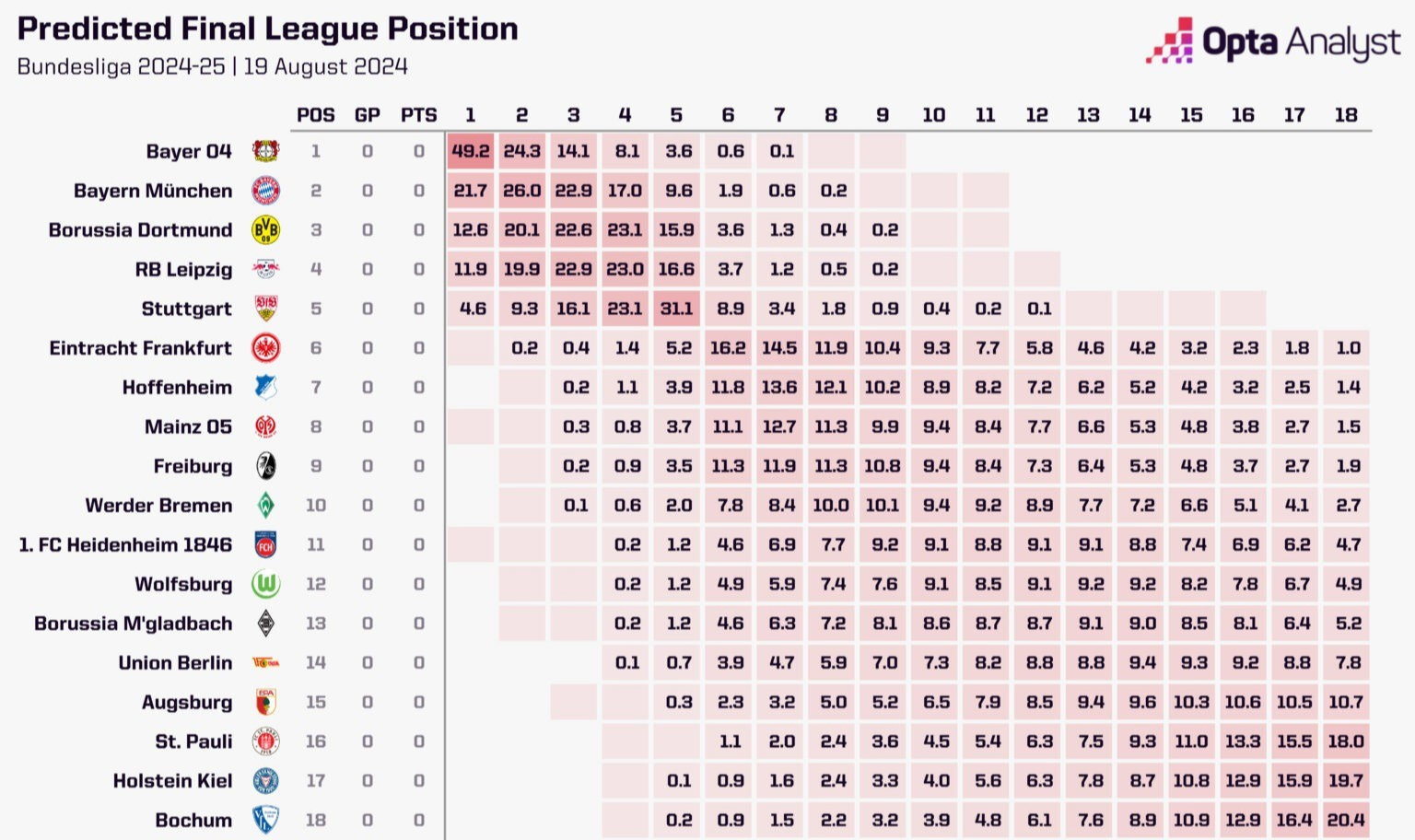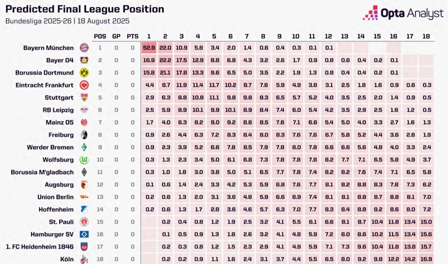 2025-2026赛季的德甲联赛将进展拉开帷幕。而在新赛季的首场比赛、即揭幕战的较量中,就会演出卫冕冠军拜仁在主场迎战莱比锡的焦点大战。关于新赛季的德甲而言,其实联赛的主题和悬念依旧不会有任何的蜕变:到底,谁才是那支不错冲破拜仁操纵联赛冠军的球队? 是以按照老例,Opta也发布了新赛季德甲的全面讨论来为德甲联赛预热。 Opta发布德甲联赛名次,争冠、前四&左迁球队的全面讨论 联赛名次讨论