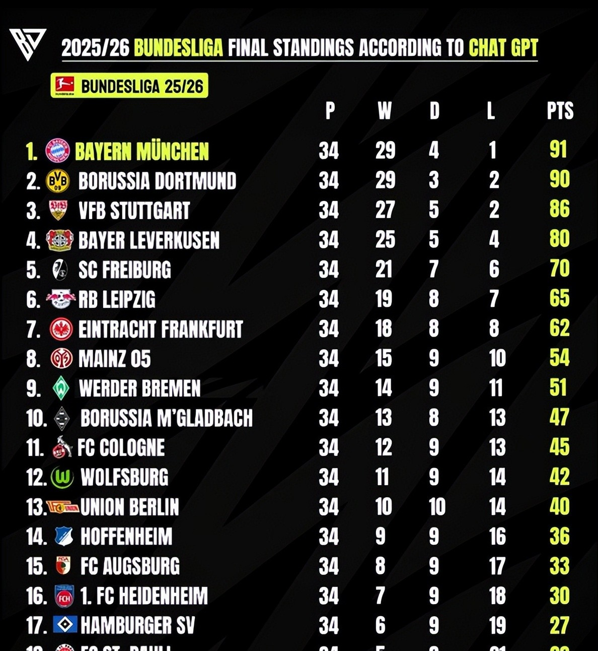 2024年的8月20日,也便是一年前的今天,Opta按照老例发布了其时关于还未开打的24/25赛季德甲的讨论。其时的讨论,由于勒沃库森在23/24赛季创造了不败的夺冠外传以及拜仁继承了英冠级别的主帅孔帕尼的情形,一度让外界不看好南大王的争冠之旅。 但好在,当勒沃库森的神奇绝平或逆转不再高频出现且拜仁的表现也相对踏实了之后,德甲也很快堕入到了莫得悬念的节拍当中。 那么,新的赛季,若是药厂和多特依旧是拜仁最大的敌手,他们到底能把联赛的悬念守护到何时呢? ChatGPT讨论新赛季德甲积分:拜仁91分慌张当先多特1分完成蝉联!仅仅,这有可能吗?