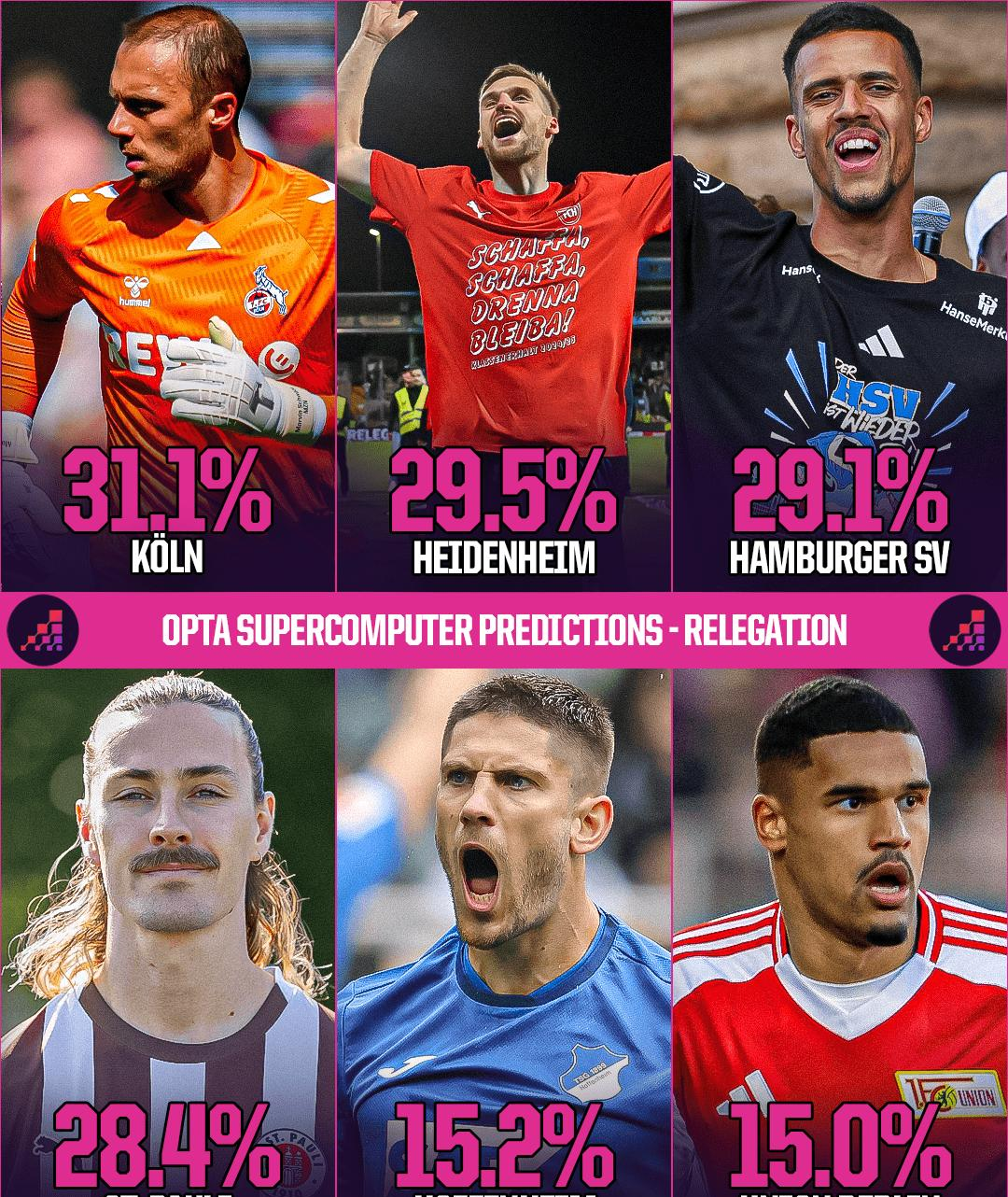 1、科隆,31.1% 2、海登海姆,29.5% 3、汉堡,29.1% 4、圣保罗,28.4% 5、霍芬海姆,15.2% 6、柏林联,15% Opta,24/25赛季德甲讨论回看:客岁还有药厂力压拜仁,本年可就不是这个戏份了