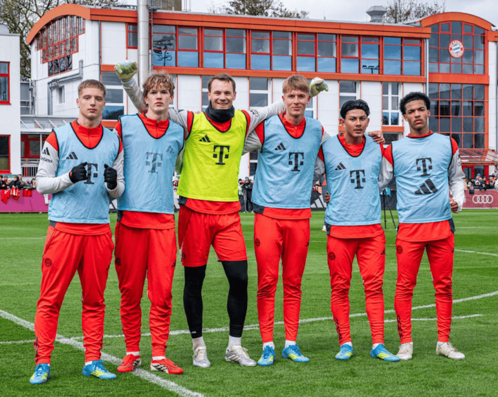 虎扑04月01日讯当地时间周二练习 结束后,拜仁领队 曼努埃尔-诺伊尔与五位年轻球员留下了一张特殊的合影。这位周五刚度过40岁生日的世界杯赛 第一名 守门员笑容满面,而他身旁的五位年轻人,只有拜仁的铁杆球迷才认识。