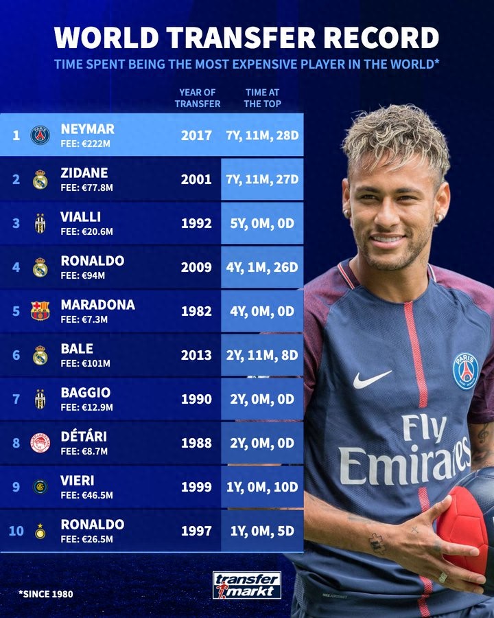 直播吧07月31日讯 德转本日在官方社媒上文书:内马尔逾越皆达内,成为保捏最高转会身价最久的球员。