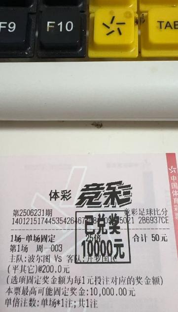 赛后,互联网上曝出该组2场竞彩比分2串1的神单,把柄票面信息走漏,该红运购彩者的中奖彩票共有6张,每张中奖票齐是2场比分复选2项串关并进行了50倍投,单票投注额均为400元。先后掷中了奥克兰城1-1博卡后生150倍比分和本菲卡1-0拜仁慕尼黑15倍比分,单票揽奖22.5万,共计奖金135万! 彩民单场固定比分50元揽1万大奖 本届世俱杯冷门束缚,此前一个比赛日,世俱杯A组小组赛收官战,波尔图4-4与开罗国民激战成和、人迈阿密海外2-2战平帕尔梅拉斯。赛后,某彩站曝出50元神单掷中波尔图“平其他”选项比分,该比分赔率高达1赔200。更为令人小器的是,这张单据无须缴税。