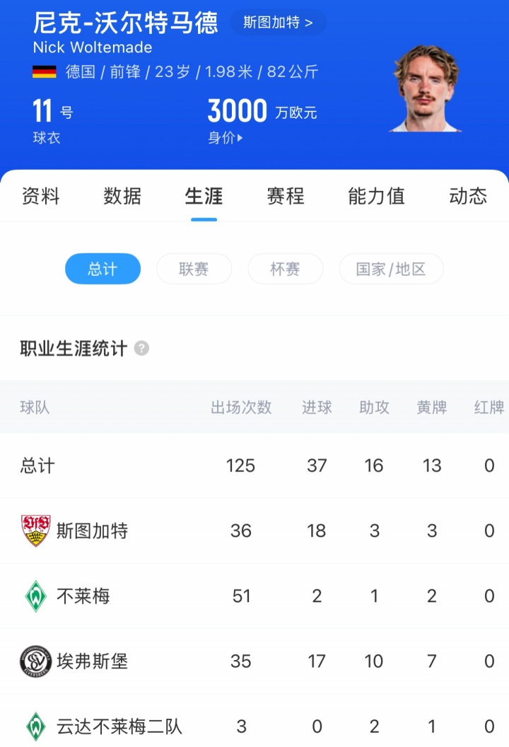 沃尔特马德现年23岁,德国先锋,与斯图加特现存契约在2028年到期,现德转估值为3000万欧。上赛季,沃尔特马德为斯图加了得战33场,打进17球并获取3次助攻。