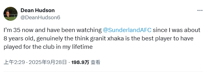 英超升班马桑德兰本赛季开局清楚出色, 6轮仅1负现在名次前5。球队新援、队长扎卡的出色清楚激勉了一位27年桑德兰原土老球迷的奖饰。 这位球迷在酬酢媒体的一篇帖子中写说念:“现年35岁的我从简短8岁起就看桑德兰的球,我败露地合计扎卡是我这辈子见到的为球队遵循的最好球员。” 这篇帖子激勉了很大反响,畛域现在已有接近200万的浏览量,不少桑德兰球迷在帖文下抒发了共识,但也有东说念主暗意有不同倡导。 33岁的瑞士中场扎卡本赛季为桑德兰出战了6场比赛,孝敬3个助攻。六场比赛他得到的sofascore评分差异为:6.6、6.9、7.5、7.7、6.9以及8.5。另一家评分机构WhoScored的数据则自满扎卡是英超本赛季现在为止评分最高的中场球员。 |