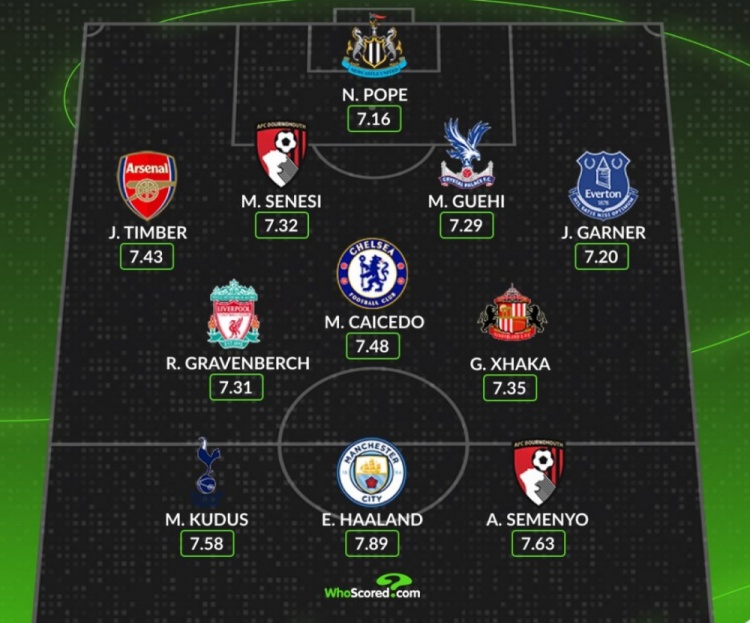 10月8日讯 WhoScored列出本赛季英超开赛于今的最好声威,哈兰德、凯塞多、扎卡、廷伯在列。 WhoScored本赛季于今英超最好阵: 门将:波普(纽卡)...