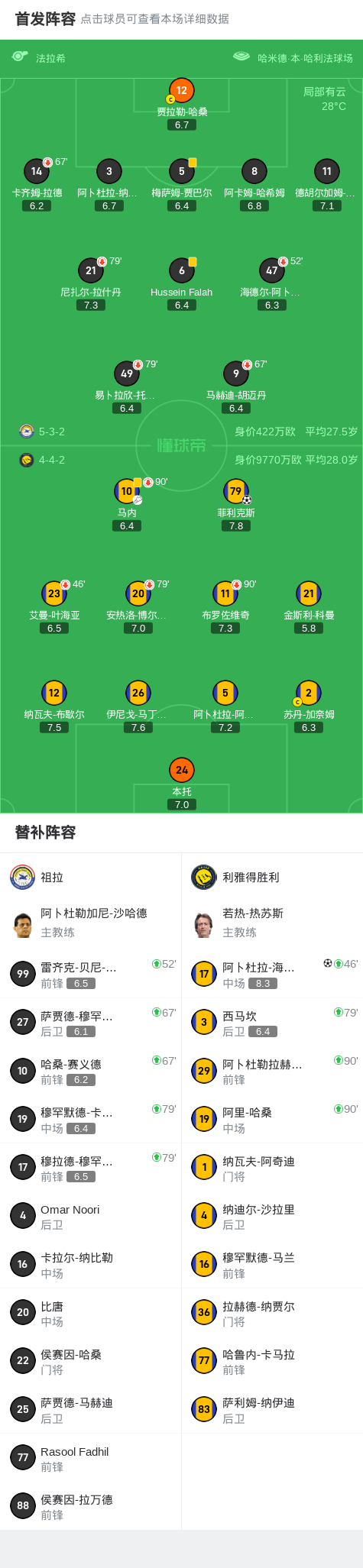 ![]() 北京时候10月2日,亚足联冠军联赛二级联赛小组赛第2轮,祖拉迎战到手。比赛中,阿卜杜拉-海巴里安适施射破门,为利雅获取手先下一城。随后,马内送出助攻,菲利克斯精彩搓射破门锁定胜局。最终,祖拉0-2不敌利雅获取手。 要害事件 第52分钟,阿卜杜拉-海巴里二点迎球抽射破门,利雅获取手1-0! 第81分钟,菲利克斯多东说念主合围中四两拨千斤搓射破门,利雅获取手2-0! 精彩蓦地 两边球员步入球场,比赛行将打响 第3分钟,梅萨姆-贾巴尔抢前点头球攻门,皮球被挡出 第5分钟,托米瓦冲破小角度劲射,本托将球挡出 第29分钟,菲利克斯门前迎球施射,皮球被挡出 第31分钟,阿卜杜拉-阿姆里倒挂金钩扣门,皮球偏出立柱 第36分钟,利雅获取手后防被打穿,托米瓦扣门被充公 第39分钟,侯赛因-法拉赫铲东说念主犯规,被出示黄牌 第47分钟,科曼后点凌空扣门,皮球偏离目的 第60分钟,马内单刀契机,没能过掉门将 第74分钟,祖拉要挟反击,中路包抄球员没打上 球队威望 ![]() 时间统计 ![]() |