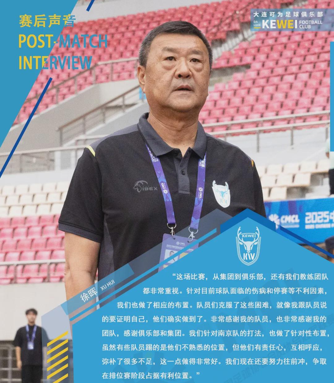 雷速体育10月5日讯 10月4日,2025中国足球协会会员协会冠军联赛总决赛第六轮,大连可为在主场大连普湾畅通场迎战强敌南京铁虎河海。上半场第4分钟,于泽源便接葛宇翔助攻打入进球,大连可为获得梦境开局。下半场,葛宇翔接张达驰头球摆渡,门前扫射平直,大连可为2-0,随后吴丁卯又在门前补射,将比分扩大为3-0! 本场比赛,大连可为濒临着诸多辛苦,不仅两名球员停赛,队中又有多名球员因为伤病而无法出场,连替补名单齐莫得报满!关联词比赛中,可为将士高下一心,面对辛苦,征服辛苦,证据了我方的实力!同期通过这一场告捷,也为大连可为在后续的比赛中赢得了主动! 焦点蓦然 4分钟,葛宇翔直塞,于泽源插上将球打进,1-0! 52分钟,白合提亚尔·排孜拉将球大限度通常至禁区旯旮,张达驰高高跃首先球摆渡至小禁区内,葛宇翔抢点扫射将球打进!2-0! 77分钟,汤郡豪禁区旯旮低平球传到小禁区,张达驰回身脚后跟敲门被对方门将扑出,吴丁卯补射将球打进!3-0! 赛后声息 ![]() 荣耀技能 ![]() 本场比赛攻入一球的于泽源再次被评为最好球员!这是他本赛季第四次获此盛誉! 第十二东谈主 ![]() ![]() 感谢所有到场球迷一又友们,你们的高唱壮胆声是咱们拼搏的最大能源! 精彩蓦然 ![]() ![]() ![]() ![]() ![]() ![]() ![]() ![]() ![]() ![]() ![]() ![]() ![]() ![]() 赛事预报 ![]() |